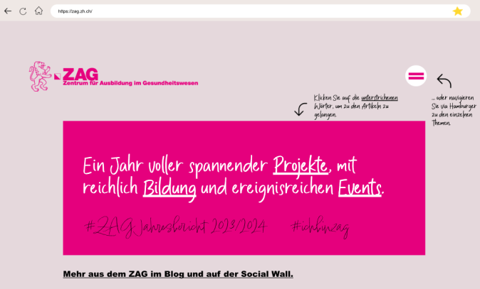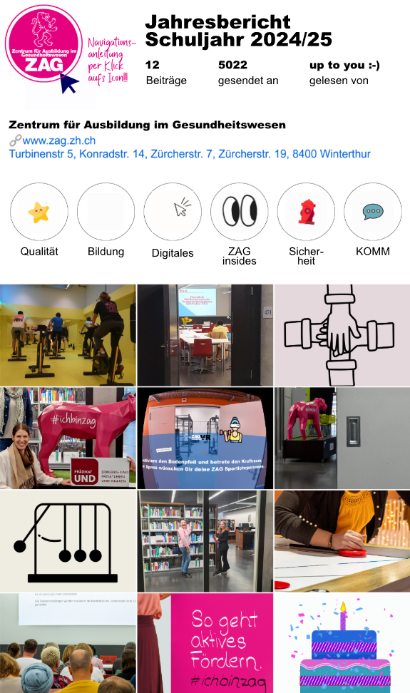 Herzlich fordern wir alle Lernenden, Studierenden und Mitarbeitenden des ZAG auf, uns Ihre Anliegen und Ideen für Veranstaltungen, Aktivitäten oder Informationen aus dem Bereich Gender und Diversity zu senden: GenderundDiversity@zag.zh.ch